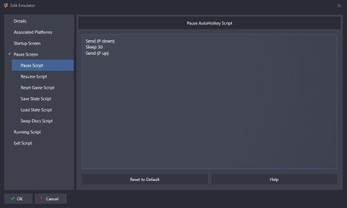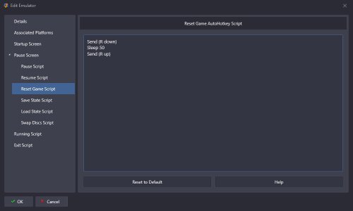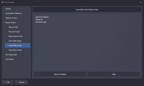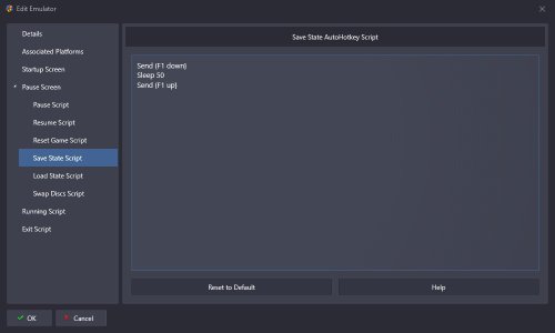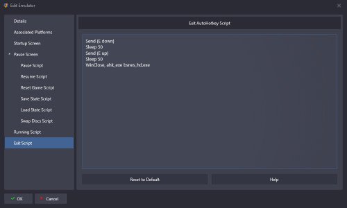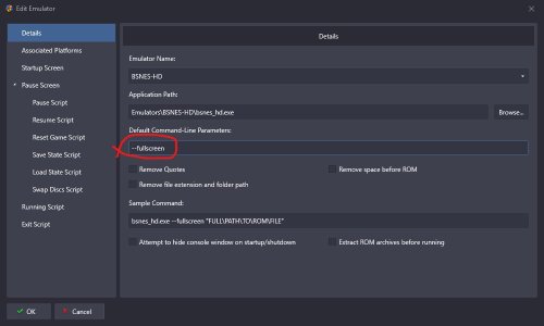 You can launch BSNES-HD out of LaunchBox in full screen mode by using the parameter "--fullscreen": I prefer custom hotkeys in the emulator - which makes the LaunchBox/BigBox Pause Screen more usefull. This is my setting: Hotkeys in BSNES-HD Pause Script Reset Script Save State Script Load State Script Exit Script
