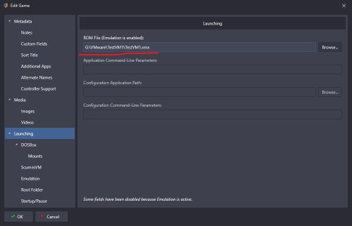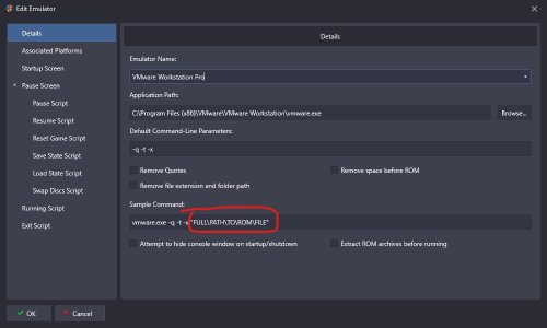 Does anybody know how I can find out the full path of ROM file for Running or Exit Scripts? My intention is to run "vmrun.exe" - where I can pass the full path of the rom file - in my case this is a VMX file: I am reading about the variable "%1%" in many threads here, but this seems only work, when I use a separate AHK script. But I don't want mess my LaunchBox with additional AHK scripts. If possible - I would like make use of the onboard possibilities of LauchBoxs "Running Script" and "Exit Script" freature ...