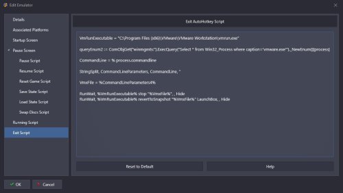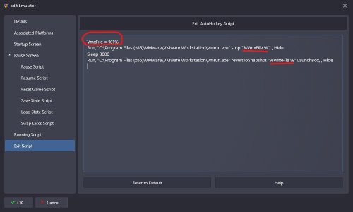 Okay I got it working! Here is my code: VmRunExecutable = "C:\Program Files (x86)\VMware\VMware Workstation\vmrun.exe" queryEnum2 := ComObjGet("winmgmts:").ExecQuery("Select * from Win32_Process where caption='vmware.exe'")._NewEnum()[process] CommandLine = % process.commandline StringSplit, CommandLineParameters, CommandLine, " VmxFile = %CommandLineParameters4% RunWait, %VmRunExecutable% stop "%VmxFile%", , Hide RunWait, %VmRunExecutable% revertToSnapshot "%VmxFile%" LaunchBox, , Hide In my setup I do not use the "$ESC::" event. And I also don't have to run "WinClose, ahk_exe vmware.exe" to quit/end "vmware.exe". For this to work, the following options must be set in the settings of the VM instance: In this way if you exit via LaunchBox Pause Menu - then VMware Workstation does exit automatically after a virtual machine instance has stopped. Thanks again for your input @JoeViking245 - your approach helped me to continue my LaunchBox powered Emulation PC setup! đ Now I am able to launch my "Retro OS Collection" (=as VMware Virtual Machines) via LaunchBox resp. BigBox đŽđšī¸đ