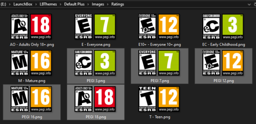 Images for rating are stored in "Ratings" directory of the current LaunchBox theme: LaunchBox\LBThemes\[YOUR THEME]\Images\Ratings\ In my case I use the "Default Plus" theme and copied simply all the existing ones of the "Default" theme and renamed it to my European pendants: Below a very useful comparison of all rating logos: (source: https://www.kaspersky.de/blog/gaming-age-ratings/7271/#:~:text=PEGI (EU)%3A 7%2B,E â fÃŧr alle Altersklassen freigegeben) PEGI rating images and additional information you can find in these websites: https://pegi.info/ https://en.wikipedia.org/wiki/PEGI#Age_ratings