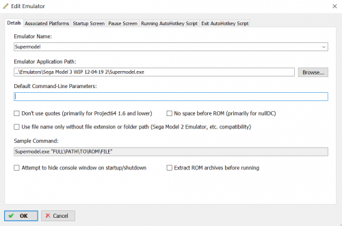 Thank you for the reply, and the help offered! All of my settings match yours. I've noticed that if I place the Supermodel.exe inside of my MAME folder with its thousands of ROMs, and inform Launchbox that I've moved the Supermodel executable, then everything launches. The Supermodel.exe has to be in the same folder with the ROMs. But, if I leave the Supermodel.exe in its usual folder separate from the ROMs, then even if LB knows where the ROMs and Supermodel.exe are located, it cannot launch the ROMs. I think that I'm missing a setting within Supermodel that tells it where the ROMs are located, or something else I'm missing. Within the Supermodel folder, I have added the path to my ROMs within the ROMs "dir.txt" file. But, no joy. I may just have to find the Supermodel ROMs, extract them from the MAME folder, and then place all of them in the same folder with the Supermodel.exe to get everything to work, but I'd like to avoid removing ROMs from my MAME set, if at all possible. Any further advice? Thanks again.