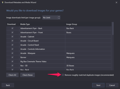 Update... i redownloaded the media for my library (FWIW, it's almost entirely PC games) with Remove roughly-matched duplicate images (recommended) unselected (it was selected in all previous attempts).