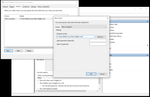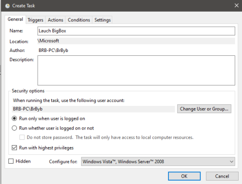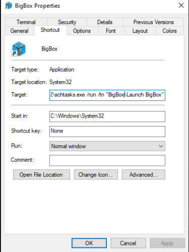 4. C:\Users\BrByb\LaunchBox This is the default directory of the installer if I remember correctly. Just some background info. This is a fresh install of Windows 10 for a dedicated gaming box I am putting together. My goal is to replace the windows shell with BigBox so that it boots directly into BigBox. But to do that I need to have a working shortcut to Bigbox first. I COULD have it run as Administrator. But then every time I boot it will have that annoying UAC prompt.