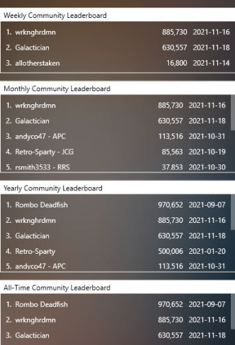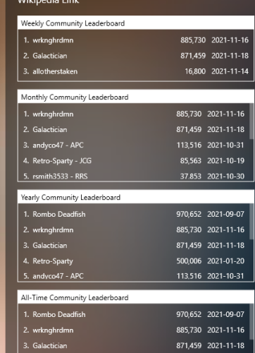 I just saw something even weirder when I went to play a game of Tempest today. It's currently showing my high score, posted today (I haven't played yet), as 630,557. I mean, I wish I was that good, but I definitely am not. Any idea why my name would show with this score? This definitely isn't me.