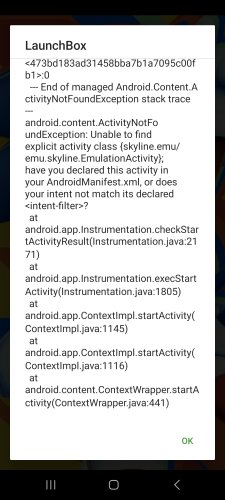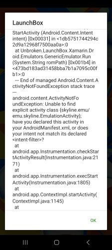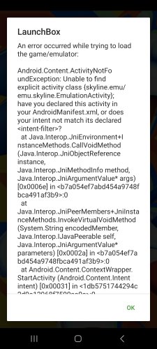 Galaxy S20+ and Android Version 13. Yes, I have 1 game and it works directly in Skyline. It gave me the option to update LaunchBox again today, so I tried it and it looks to be the same error message. -