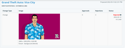 So I thought that I could upload official artwork, instead, so backgrounds would look better. So I made my contribution by replacing the previous artwork by this one, featuring Tommy Vercetti, the main protagonist of this game, drawn by Stephen Bliss , the Rockstar Games artist behind the iconic artworks of GTA and RDR2. But they were rejected... And yes, I left a comment explaining why of this change, about the official Rockstar Games sources... But still, I got rejected.