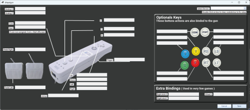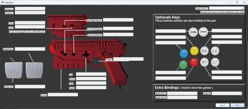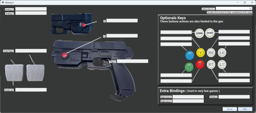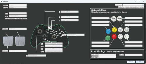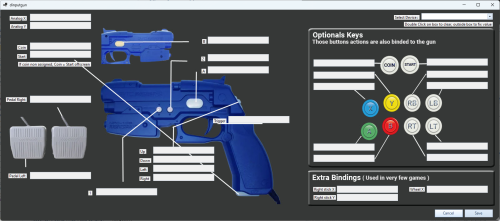 I use full joystick mode as Dinput, not rawinput. Demulshooter is auto run on game launch, but it's only used for crosshair removal and recoil outputs, not for managing inputs. Gun4ir, Sinden, Wiimote (with lichtknarre) support this. And i guess the Aimtrak too as i saw the option in their utility tool. For demulshooter, I want to simplify the process to get outputs to the gun and be able to get them directly from the app and not from mamehooker (even if i will leave an option to run mamehooker as well)I don't know the aimtrak gun very well, but from what i saw, it's not possible to trigger recoil outputs for this gun ? So far, i plan to auto-manage outputs for Sinden (with an home made custom driver software) and Gun4ir. Also, with this gun, how do you bind Coin/Start ? Do you bind them to other device (like buttons on an arcade pad or keyboard ?) As of now, this is a quick preview of the configurations menu : And to give a game as an exemple : And depending of the device plugged, it will show the inputs. Here is in xinput if you only have gamepad pluged. But if you set device as lightgun and they are plugged, you will get one of those. I try to fit the game inputs to the selected device in a way i think it's the most fit. I have some custom code that allow me to bind multiple buttons to the same action, so i abuse that on gun that have multiple buttons. (Ah, and the sinden gun have multiple variation depending of the pump configuration)