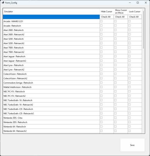 MouseHideAndLock2 View File https://github.com/nixxou/MouseHideAndLock2 It's a rewritten version of my plugin MouseHideAndLock, while using the original one, i got some issues & crash that's why i did an other version. Also, i'm not using startup screen and since disabling mouse requiere startup screen enabled, this plugin is useful for me. So, in the configuration file, you got something like this : You can select the configuration for each platform & emulator. Hide Cursor : Will hide the cursor once the game is launched. Show Cursor On Move : You need to also have Hide Cursor checked for this to work, with this option enabled, moving your mouse will show up the cursor, it's only hidden when it's not moving. Lock Cursor : Will lock your cursor on your main monitor, if you press Shift while moving the cursor, you will be able to go to other screen. Submitter Nixx Submitted 08/07/2023 Category Third-party Apps and Plugins