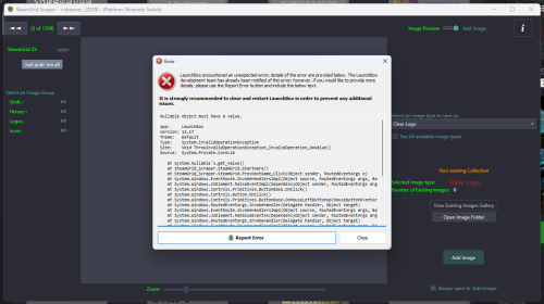 One more issue I came across: I selected all the games in a platform, and upon clicking the >> button to select the next game, I received this error (attached photo). Subsequent tries at advancing to further games kept popping up this error. When I came across a game it had in the database, the error disappeared. Once it again found a game without a title in SteamDB Scraper, the error would return. -