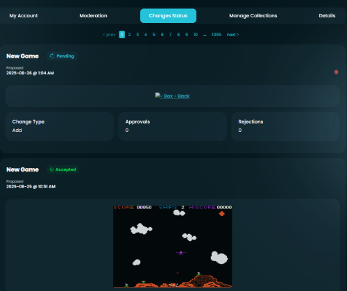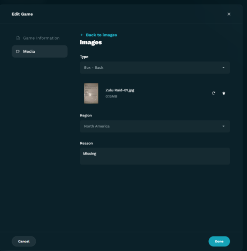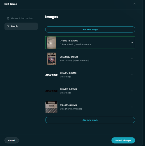 I have recently been having trouble adding missing images to existing entries. There is no problem creating new entries or updating metadata for existing entries but when i try to add missing images they seem to upload but when i check the submission status it shows as a blank entry. And yes i am using JPG and PNG files appropriately. It seems to accept replacing of existing images as i have just done that successfully with a better box cover but as mentioned new image additions don't seem to get uploaded to the submissions status page.