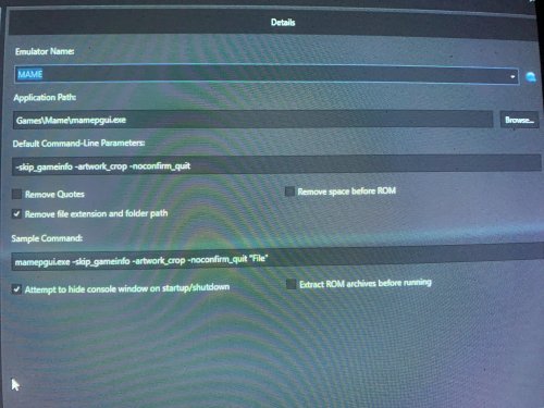 6. I wish that were the case, but for me there is. I have the mame.ini in the root folder already, and I tried taking out all of my command line arguments, but no dice. In MAME the controls work perfectly, but launching it with launch box they don't work. When the game starts, I can hit tab and see that the contols are still mapped, but the joysticks and buttons do nothing. I'm using Windows 10, and use SJ@JX usb encoders (https://www.amazon.ca/gp/product/B083RTT51K/ref=ppx_yo_dt_b_asin_title_o00_s00?ie=UTF8&psc=1) connected to arcade sticks and buttons. My MAME is an older version 0.122u1, but on it's own it works mint.