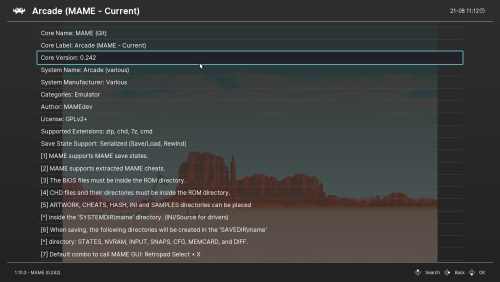 2. I selected mame_libertro.dll in the drop down. It does launch the title of core as Arcade(Current-Mame) but it does not load the game. So that is interesting the the CORE INFORMATION is classed Mame (Git) yet there the core is called mame_libertro.dll However it is odd that it only seems to work when I have to open RetroArch only now. The other observation I notices is that it defaults the custom bezels to the default Arcade bezel. So something isn't configured correctly. If anyone else is having success, let me know what your configuration is to open mame roms. I'll keep searching forum and YouTube. I appreciate the support neil9000 and Overlord! Proof below that the same ROM loads with custom bezel when I manually open RetroArch and then select - CONTENT - CORE Arcade (Mame-current) vs. Configuring CORE for ARCADE in ASSOCIATED PLATFORMS to mame_liberto.dll as the core drop box and running, thus getting no loaded game and a default bezel rather. Both show a center title screen that says the core is Arcade (MAME-Current)