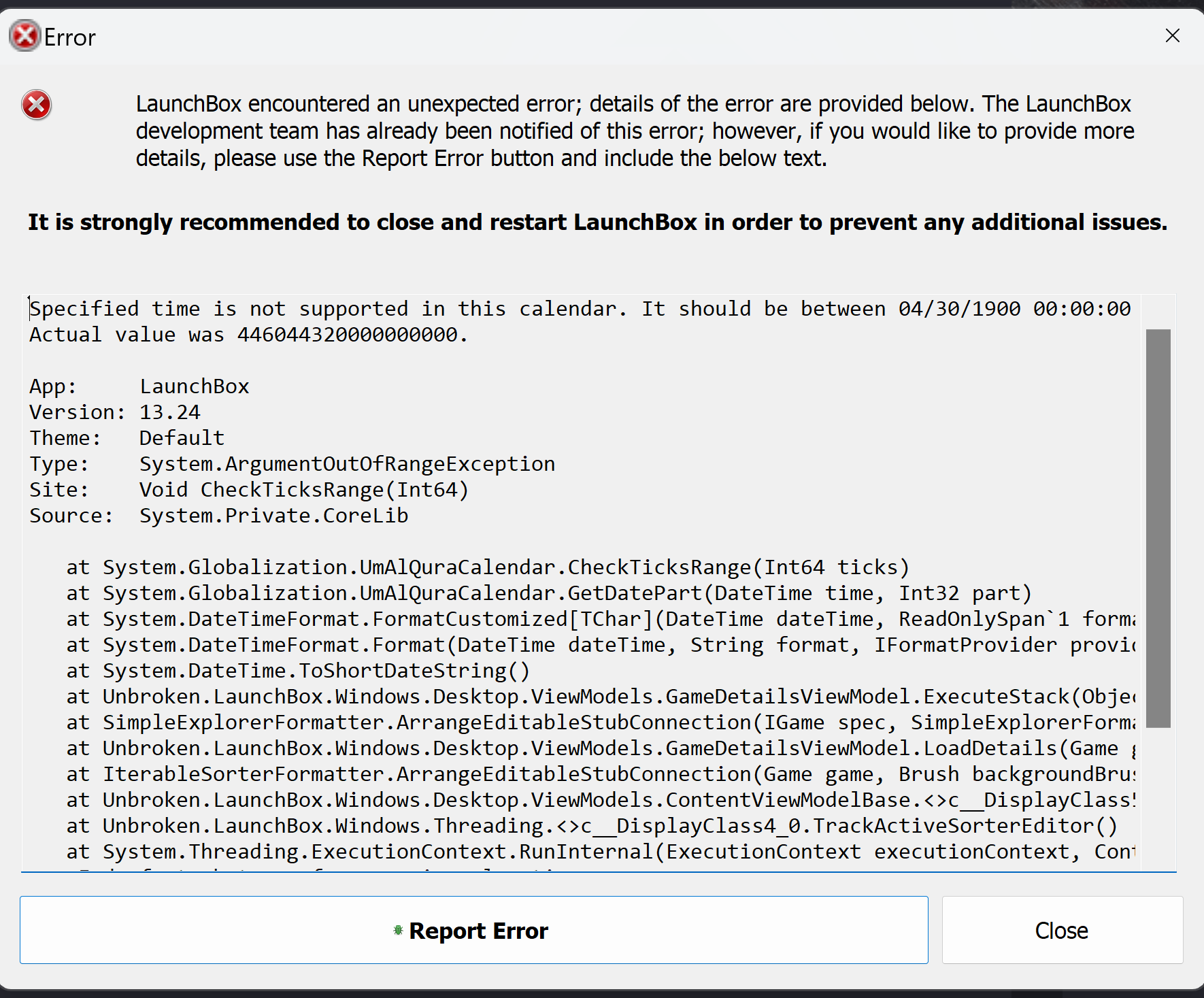 2. When I run Launchbox or BigBox, an error message appears with every operation I perform. I did not attach a picture of the error, but it contains an error that the date is not compatible or something similar. After many attempts, I found that the problem is with the Arabic version of Windows 11, and when I change the Windows to English, the problem disappears. Please, can the Launchbox team update the program to be compatible with Windows 11, like Windows 10? I did not face any problem before. Thank you. (If you want a picture of the error, I will upload it later if necessary, because I deleted the program and installed it more than once without any benefit.)