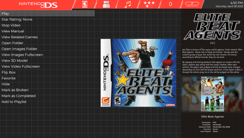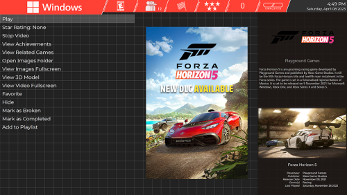 About: This theme is inspired by Pegasus Frontend's default theme. I personally really love the look of Pegasus, but vastly prefer the functionality of Big Box, so this is me doing my best to combine both worlds. Excluding those credited below, all other custom assets were created by me. As a note: This theme was designed in 4K for use on a large television. Scaling issues present in previous versions have been fixed, to my knowledge. This WIP upload is intended to get fresh eyes on the project and help to identify issues I may not be running into with my limited usage, as well as provide a better version of this theme than was currently available during a period of time where I don't have as much free time as I have previously. Credits: Genre Icons: Game Icons Platform Clear Logos: v2 Platform Logos Professionally Redrawn + Official Versions, New BigBox Defaults 2.1.0 Platform Banners (Present only in legacy versions): BannerBox 2.1 Platform Media: System Media - Stencil Platform Images 1.0. Platform Images: COLORFUL Hardware PNG media (1x1) 1.1 Finally, many thanks to @y2guru for the Community Theme Creator. While this version no longer uses the CTC, I would have never started on this journey, nor gotten nearly as far, without it.- 13 comments