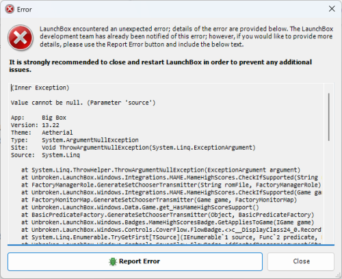 Error Value cannot be null. (Parameter 'source') when I tried to click the Filter icon on any Platform/Playlist that contains the MAME rom path, after updating MAME 0.263 to 0.277. Not sure if this is related to the MAME update as I haven't use the Filter icon for quite some time until recently when I try to filter and generate different playlist for MAME. Value cannot be null. (Parameter 'source') App: LaunchBox Version: 13.21 Theme: Omni Type: System.ArgumentNullException Site: Void ThrowArgumentNullException(System.Linq.ExceptionArgument) Source: System.Linq at System.Linq.ThrowHelper.ThrowArgumentNullException(ExceptionArgument argument) at Unbroken.LaunchBox.Windows.Integrations.MAME.MameHighScores.CheckIfSupported(String romFile) at ManagerParamWatcher.FindDataSchema(String romFile, ManagerParamWatcher) at Unbroken.LaunchBox.Windows.Integrations.MAME.MameHighScores.CheckIfSupported(Game game) at ResolverMockWatcher.FindDataSchema(Game game, ResolverMockWatcher) at Unbroken.LaunchBox.Windows.Data.Game.get_HasMameHighScoreSupport() at Unbroken.LaunchBox.Windows.Desktop.ViewModels.SideBarViewModel.<>c__DisplayClass110_1.CreateCompositeAccount(Object) at Unbroken.LaunchBox.Windows.Desktop.ViewModels.SideBarViewModel.<>c__DisplayClass110_1.PatchTypeAuthentication(Game game) at Unbroken.LaunchBox.Windows.Threading.<>c__DisplayClass13_1`1.ConcatMetaMock() at System.Threading.ExecutionContext.RunInternal(ExecutionContext executionContext, ContextCallback callback, Object state) --- End of stack trace from previous location --- at System.Threading.ExecutionContext.RunInternal(ExecutionContext executionContext, ContextCallback callback, Object state) Recent Log: δΈε 12:54:47 Exception
