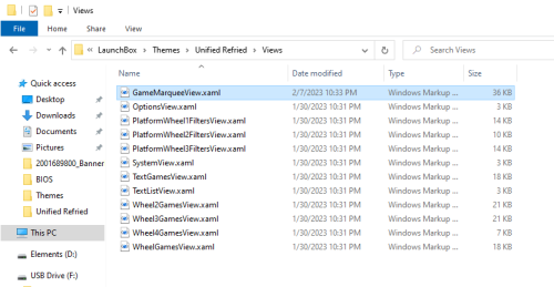 24. I have a question regarding view XAML files, specifically the GameMarqueeView.xaml file. I've created a custom marquee view that has conditional settings that will display official arcade marquees when an arcade game is selected and display custom console game marquees for any other type of game selected. I really like the look of the Unified Refried theme and tried to copy my GameMarqueeView.xaml to the themes view directory, but its not displaying. I have a feeling the overall theme is not programmed to use that file. Is there any way to get it to recognize / use my file? Thanks in advance for any assistance.