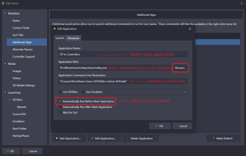 2. @Gangor Sorry if its complicating, but this is the best way I could get mine to work without issue. 1. Add Additional App screenshot - This is to create the app within Launchbox that will run the AutoHotKey script to launch xarcade-xinput program when you launch the game. 2. Create Additional App screenshot - Name your application (can be anything). Browse to where AutoHotKey is installed (this comes with Launchbox). Application Command-Line Parameter is the full path to where the AHK is for Killer Instinct to launch the xarcade-xinput program 3. Application Path screenshot - This will point to the AHK to launch your game. The reason this is needed is because this is the only way I could get LEDBlinky to detect the game running and change the lighting accordingly Sample Killer Instinct AHK - This is the AHK to run xarcade-xinput when game is run. This is used in the Additional App section. Sample Killer Instinct Launcher.AHK - This is the AHK that I have in place to launch the game so LEDBlinky will detect the game properly. This is used in the "Launching" section. 4 Player IPAC.json is the config file for xarcade-xinput, The key binding you'll change is the text in the quotes on the left, change to the key you want bound to that input. This is for 4 player games. If all you want is 2 players, there are config files included in the program directory in the "mappings" folder. You can use any text editing program to make the changes. Hope all this makes sense. I used Killer Instinct as an example as this was the game you mentioned above. 4 Player IPAC.json Sample Killer Instinct AHK.ahk Sample Killer Instinct Launcher.ahk