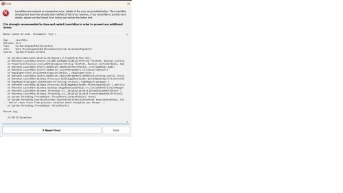 2. LaunchBox previously worked fully. I imported a bunch of PSP ISO files, and everything downloaded successfully as far as I could tell. Then, to be sure, I tried to "Update Medata and Media for All Games". The metadata downloaded successfully, then at the next stage, which I suppose is media downloading, at the very end after it downloaded the last file (e.g. 2400/2400 downloaded), I get a message saying that "LaunchBox encountered an unexpected error." There was an info box below with the following text (a screenshot is also attached): ============================================================================ Value cannot be null. (Parameter 'key') App: LaunchBox Version: 13.2 Type: System.ArgumentNullException Site: Void ThrowArgumentNullException(System.ExceptionArgument) Source: System.Private.CoreLib at System.Collections.Generic.Dictionary`2.FindEntry(TKey key) at Unbroken.LaunchBox.Search.LocalDb.GetMameFileResult(String filePath, Boolean useFolderNames, GameBase game) at PropertyInitializer.ExcludeMetaComposer(String filePath, Boolean useFolderNames, GameBase game, PropertyInitializer ) at Unbroken.LaunchBox.Search.EmuMovies.EmuMoviesSearchValue..ctor(GameBase game) at Unbroken.LaunchBox.Search.EmuMovies.SearchParameters.CalcGenericWorker() at MappingMerchant.ExcludeMetaComposer(Object , MappingMerchant ) at Unbroken.LaunchBox.Search.EmuMovies.SearchParameters.GetResults(String userId, String password, Func`1 isCancelled, Action`2 reportIndeterminate, Action`1 onError) at Unbroken.LaunchBox.Windows.Processes.BulkImageDownloader.QueryRemoteSpecification(Object instance) at PageRegistryWrapper.RateMetaServer(String instance, PageRegistryWrapper ) at Unbroken.LaunchBox.Windows.Processes.BulkImageDownloader.ProcessQueue(Func`1 getIsCancelled, String activeImageGroup, Action`2 onIndeterminateUpdate, Action`4 onUpdateAction, Action`2 onGameImageDownloaded) at Unbroken.LaunchBox.Windows.Desktop.ImageDownloaderHelp.<>c.ExcludeNotificationMapper() at Unbroken.LaunchBox.Windows.Threading.<>c__DisplayClass0_0.DisableScopeRef(Object ) at Unbroken.LaunchBox.Windows.Threading.<>c__DisplayClass0_0.ConnectRemoteDefinition() at System.Threading.ThreadHelper.ThreadStart_Context(Object state) at System.Threading.ExecutionContext.RunInternal(ExecutionContext executionContext, ContextCallback callback, Object state) --- End of stack trace from previous location where exception was thrown --- at System.Threading.ThreadHelper.ThreadStart() Recent Log: 22:20:52 Exception ============================================================================ Can anyone help with this? What happened and what does this error mean? Thanks.