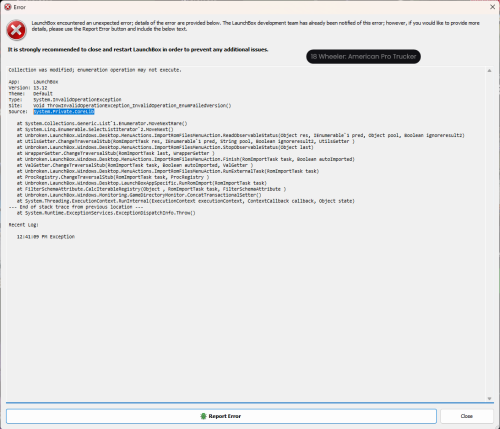 Getting this error after updating to 13.12 a few days ago. It seems to appear after Launchbox searches for more ROM files. then tries to save them. I snippet a screen shot of the 'Saving games...' from the top of Launchbox as well. This blue line/indicator just goes left and right continuously. If I 'Report Error', which I have done but heard nothing back, or press close, Launchbox closes as well as error box.