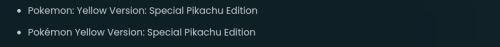 - The main game title "Pokémon Yellow Version: Special Pikachu Edition" but the cover indicate Pokémon Yellow Version Special Pikachu Edition without the ":" , and I'm missing the full uppercase in the "YELLOW VERSION" part