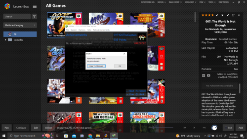 This is my first time trying to use LB. I got everything set up, emulator selected (RAP64), and games list populated. I signed in with RA API via Tools>Options>Integrations>RetroAchievements, scanned for achievements, and verified my login creds. When I launch a game from RAP64, everything shows up fine. When I use LaunchBox to boot a game via RAP64 it says game has no achievements. When I go to View Game Hash in the LaunchBox loaded RAP64 it says No Game Loaded.