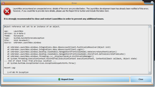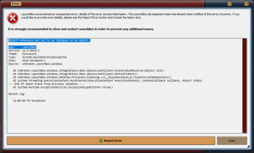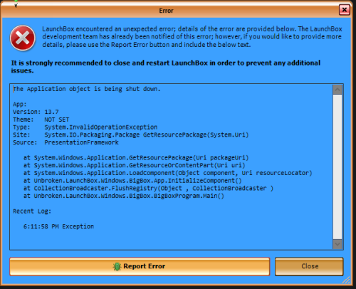 Hi, So now I got his...attached a screen shot of error as well as logs. Big Box seems to be working ok, when I open LaunchBox I get this error and when I close the error window LaunchBox shuts down as well. I have no idea what caused it, I played some, turned it off to sleep and when I woke up and got back on this is how I was greeted. Debug 2023-11-30 11-29-10 PM.log Debug 2023-11-30 11-34-28 PM.log -