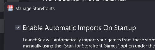 Game Discovery Center Recommending Hidden GamesB-17 Bomber replied to B-17 Bomber's topic in Troubleshooting In order to resolve this issue, I reinstalled Launchbox and attempted to recreate the problem. Big Box respected the games that I marked hidden, although it did show artwork from hidden games at one point. However, this did not persist. What I would like to see is a way to disable all automatic imports on installation and initial startup. Placing the "Enable Automatic Imports On Startup" option during the install would have solved this problem for me. I could have unchecked it and Launchbox would have no preinstalled games or image assets on first boot. Launchbox is a fantastic program, and I appreciate everyone's efforts to understand and improve it.