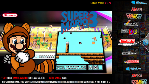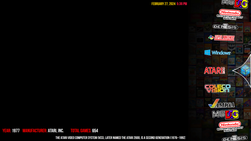 Enclosed are two images showing my issue with every theme for BigBox. When I scroll through the consoles, the main images/animations dont show. Yet it shows it for NES, only. It doesnt show for Genesis, SNES, Atari, Coleco, Amiga, MSDOS, or Windows. I wanted to add a few more consoles, but holding up on that, until I get BigBox working correctly.