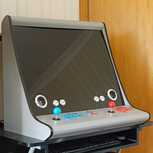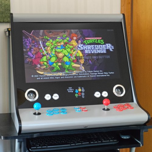 Designed in CAD to be as small as possible with a subwoofer inside. The original concept was to build a base to sit it on and also use as an upright, but I'm happy just using it as a bartop for now. It used to be powered by 2 Raspberry Pi's (one running RetroPie, and a Zero to display the controller images on the 5" display), but it was a pain to work with, so I swapped them out for an Intel N95 mini PC with LaunchBox.