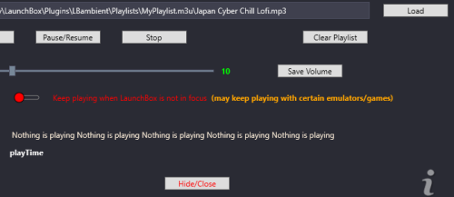I have installed the plugin and added a playlist etc, the track plays when i boot up launchbox, but despite the toggle being set to stop the music when lb is not in focus, it plays continually, in games, in and out of focus.