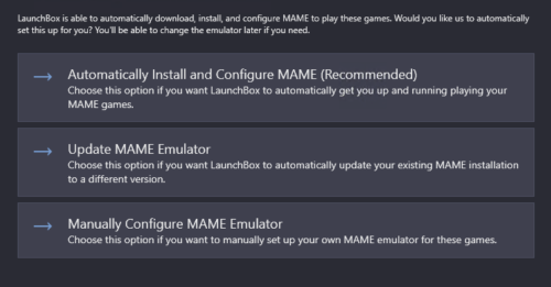 The MAME import wizard is making some assumptions that its not telling the user what those assumptions are. Seems like more words are needed here. Roms are split into ROMs, CHD, and bios files. Technically CHD files aren't "roms" but I dont know what assumption LB is making. Is the wizard expecting these to all be in one directory? I have mine split into 3 directories These options aren't clear. I already used the wizard to install 0.228 so should I be choosing "update MAME Emulator" I feel like there also aren't enough words being used here to articulate what Launchbox is doing. If I choose update is it going to download mame and try to install things itself and remove my prior installation? Is it going to download into the Launchbox directory? Does it dereference the prior roms for the new roms?
