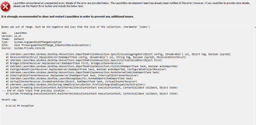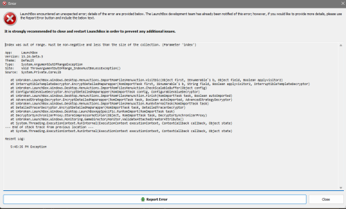 7. Can someone help me figure out what this error is and how to fix it. Thank you Index was out of range. Must be non-negative and less than the size of the collection. (Parameter 'index') App: LaunchBox Version: 13.22 Theme: Default Type: System.ArgumentOutOfRangeException Site: Void ThrowArgumentOutOfRange_IndexMustBeLessException() Source: System.Private.CoreLib at Unbroken.LaunchBox.Windows.Desktop.MenuActions.ImportRomFilesMenuAction.InvokeVirtualChooser(Object instance, IEnumerable`1 attr, Object dic, Boolean countdef2) at ReadableDictionaryFactory.SplitProject(RomImportTask instance, IEnumerable`1 attr, String dic, Boolean countdef2, ReadableDictionaryFactory) at Unbroken.LaunchBox.Windows.Desktop.MenuActions.ImportRomFilesMenuAction.SortComparator(Object info) at PoolTransmitter.SplitProject(RomImportTask info, PoolTransmitter) at Unbroken.LaunchBox.Windows.Desktop.MenuActions.ImportRomFilesMenuAction.Finish(RomImportTask task, Boolean autoImported) at LoggerDecider.SplitProject(RomImportTask task, Boolean autoImported, LoggerDecider) at Unbroken.LaunchBox.Windows.Desktop.MenuActions.ImportRomFilesMenuAction.RunExternalTask(RomImportTask task) at FactoryStructTracker.SplitProject(RomImportTask task, FactoryStructTracker) at Unbroken.LaunchBox.Windows.Desktop.LaunchBoxAppSpecific.RunRomImport(RomImportTask task) at WatcherExecutor.GenerateSetChooserTransmitter(Object, RomImportTask task, WatcherExecutor) at Unbroken.LaunchBox.Windows.Monitoring.GameDirectoryMonitor.PlayElementLocator() at System.Threading.ExecutionContext.RunInternal(ExecutionContext executionContext, ContextCallback callback, Object state) --- End of stack trace from previous location --- at System.Threading.ExecutionContext.RunInternal(ExecutionContext executionContext, ContextCallback callback, Object state) Recent Log: 3:54:18 PM Exception