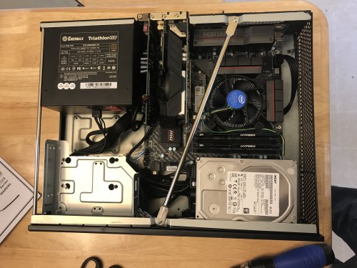 Redid the wiring like I said with moving the hard drive. Was a VERY tight fit but glad to make it work - was really worried about the USB header! You be the judge if it is cleaner though. Good thing before I took the system apart I realized something: part of the IO shield was under the USB 3.1 port near the USB Type-C port so I couldn't use the port. Took the system apart to fix that. I am having problems with my AV Receiver and TV - on-board graphics work fine but with the GPU it doesn't play nice with my AV receiver, hooked up to the TV it works okay though but due to no optical out I will need a soundcard, have one in my main PC I'll remove, won't miss it and have the PC hooked up via optical to the receiver and HDMI to the TV. Since I don't have the soundcard installed yet I don't have the header hooked up. I might move the cable now so it's easier to place when I install it though. EDIT 2 or 3: Moved audio header cable so I can easily hook it up to sound card in future. EDIT who knows what: Added sound card and put new thermal paste on CPU.
