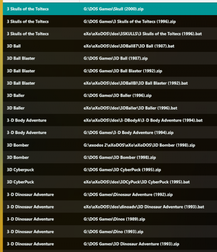 I imported all the zip files in exodos as MS-DOS roms, hoping ALL the existing metadata from the exodos install would carry over, but no luck: Kept images and manuals As shown in the screenshot, there's a lot of misidentified game names (3 Skulls, 3D Ball Blaster, 3-D Dinosaur Adventure are duplicate titles used for different *.zip files) A lot of "Notes" have been dropped, and IMHO those are important If there's some way to bulk edit ROM file extensions from *.bat to *.zip in Launchbox, that might help preserve metadata, as the Exodos *.bat files get stuck on "Error Downloading" screen when used in RA. Any ideas?