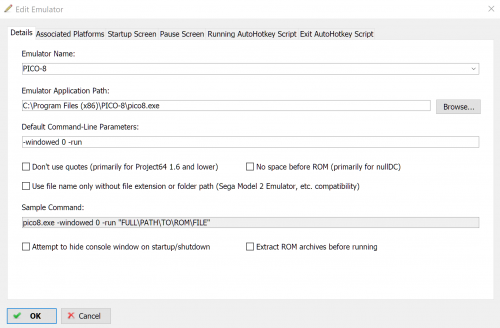 I started from scratch, installed to LB/Emulators, dragged and dropped the files for the rom process and the whole 9 yards. I can't find anywhere else on the net that people have got the "could not load pic08.exe" error either. This makes no sense at all. *shrug* The only solution I can see at this point is manually creating a modified Pico8.exe shortcut for each and every game for LB to use. -