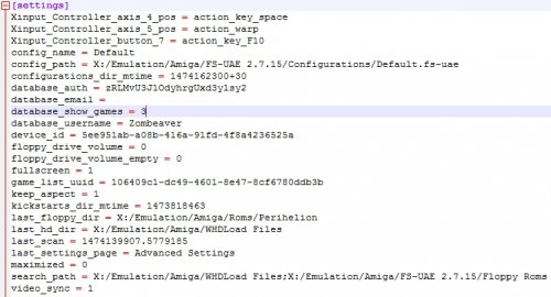So I've run into a snag with this. When you load a game like this it does not overwrite the "config_name" field in the settings.ini. The reason this is significant is that those are how FS-UAE divides up its save games. If you load up a game and the the "config name" that it has in the settings.ini is named "Default", it's going to search for your saves in (and save to) a folder structure of FS-UAE -> Save States -> Default -> DH0 -> [the name of your specific game]. This wouldn't be a huge deal if you used nothing but UUIDs because then you could just have them all in one folder and it would never change. The problem is that any time you A) simply click on a game title or a config in the FS-UAE UI or B) launch your own user-made config (for games that don't have a predefined one already) it updates that config name and now it's looking for/saving them in FS-UAE -> Save States -> [the name of your specific game/config] -> DH0 -> [the name of your specific game]. Since launching via UUID doesn't update the name, it'll search by whatever was in there previously... and now you've got a problem because it can't find them. I'm not sure what to do about this, honestly. If you were using nothing but UUIDed games and you never used the FS-UAE UI itself (because like I said, it updates the name just by clicking on a different title) it would be okay, but that's not the case. I guess one possible solution would be to create my own configs for every game that requires saving because those are the only ones that this affects and the "config_name" would update correctly in that scenario. That would kinda stink though