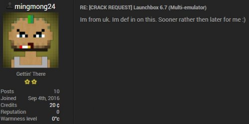 I'm not accusing you of using a cracked version - because when a crack was unable to be found, the plan in the thread then became for one person to buy a license and then share it among several members of the forum, splitting the cost between them. So you buying a license doesn't mean jack - that's exactly what was being proposed. Yeah no, clearly you're so right. Clearly two people, both named mingmong24, both inquiring about a piece of software as specific as Launchbox, within the span of a couple days, both from the UK - no biggie. Just a big ol' coinkidink. Seriously guy? How completely retarded do you think people are?