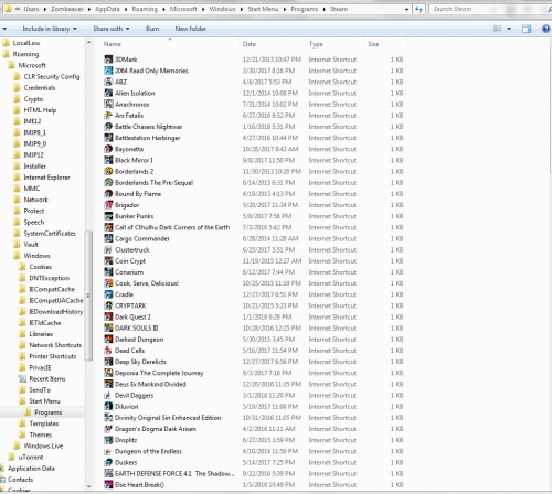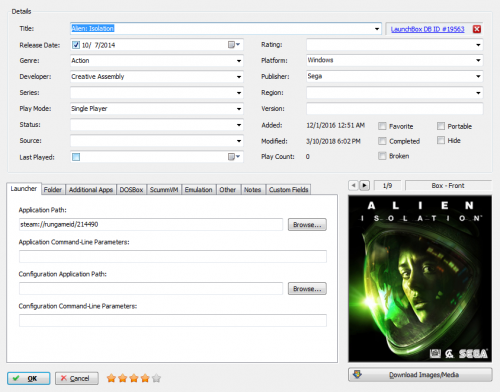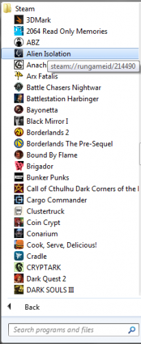 You can either drag them all into LB and use the "none of the above" function" or do them one at a time by going to "Add" and pasting the URL into the application path in the launcher tab. You can find all the shortcuts in the start menu folder by going to it in your start menu, right-clicking on it, and going to "explore". You can also get there manually by going to Users\[username]\Roaming\Microsoft\Windows\Start Menu\Programs\Steam (in 7 anyway, not sure about 10): These can be dragged right into LB and then choose the "none of the above" option in the import wizard. Alternately, you can right-click on one, go to properties and you'll see a URL: This URL can be added to the application path of a library entry. You can just use "Add" and then paste it in: