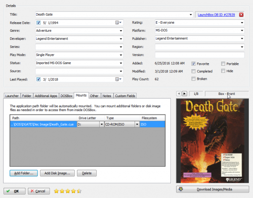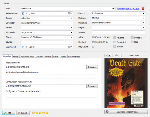 In your DGATE folder you should see a file named LEGEND.INI. Open that up in a text editor, and check to see that these lines look like this: GAMEDATA=C:\DGATE\ PICDATA=C:\DGATE\ VOCDATA=C:\DGATE\ SAVEDATA=C:\DGATE\ The folder where the game is located must also be named DGATE. Now, in Launchbox, make sure that in the "folder" tab you have the root folder set as a path one level up from DGATE. In my case, the full path to it is X:\Emulation\DOS\DGATE so you'd need to have it set to just X:\Emulation\DOS\ in that case, or, since I have relative paths, just ..\DOS\ The reason for this is the Legend.ini wants to navigate into DGATE from C: (which is the location you're specifying in the folder tab). Alternately, you could have the folder named whatever you want, have it specified in the folder tab, and just remove the DGATE\ parts in the LEGEND.INI so that they just said: GAMEDATA=C:\ PICDATA=C:\ VOCDATA=C:\ SAVEDATA=C:\ Either one would work. Also, be sure to verify that your disc image is set in the mounts tab.