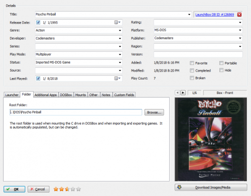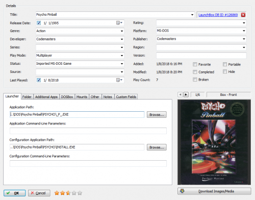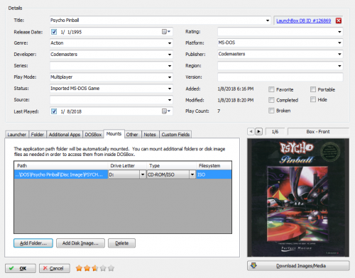 One other thing I forgot to mention - the game data has to be located in a folder named "PSYCHO", and the "root folder" in the "folder" tab needs to be set to the folder one level up from that. That's really important because if the folder is set to the "PSYCHO" folder itself, it won't work. I keep all my DOS games in a path of X:\Emulation\DOS\[game title] so in this case I've got a path of X:\Emulation\DOS\Psycho Pinball\PSYCHO. Normally the folder named after the game title (Psycho Pinball) would contain the game files, as most DOS games don't care one way or the other, but this one seems to specifically want to be in a folder named PSYCHO so I just made it a subfolder within the game title folder. I have the disc image (PSYCHO.iso) in a folder just named "Disc Image". Make sure this is set in the "mounts" tab as drive D and a type of CD-ROM/ISO.