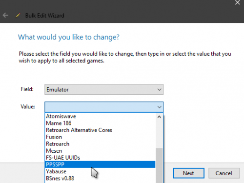 Ok so go to Tools > Manage Emulators and in the bottom left corner click the +Add button. Fill in the Emulator name with whatever you want to call it and for the Emulator Application Path browse to where you have it installed and select the emulators executable.Then in the Associated Platforms tab of that you window you will want to fill in the Associated Platform with the exact name of your PSP platform in Launchbox, difference in naming will make it not work. And in the Default Command Line Parameters put in --fullscreen like I have in the screenshot below, this will tell it to load in fullscreen mode. Now you can import your games and select PPSSPP from the list of emulators. If you have games already imported you will need to tell them to use your newly added emulator, select all your games with Control + A and then edit using Control + E. This will bring up the bulk edit tool, in the drop down menu pick emulator and then the 2nd drop down menu pick your PPSSPP emulator.