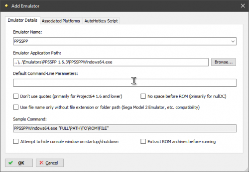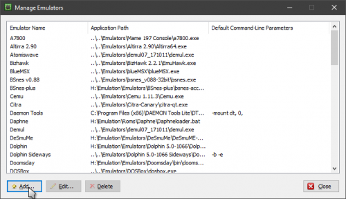 No problem, and that same procedure is the same for any emulator though in some cases the Default Command Line Parameter may be different and sometimes depending on the emulator certain check boxes in the Edit Emulator window where you set the emulator name and path may need to be toggled on or off.