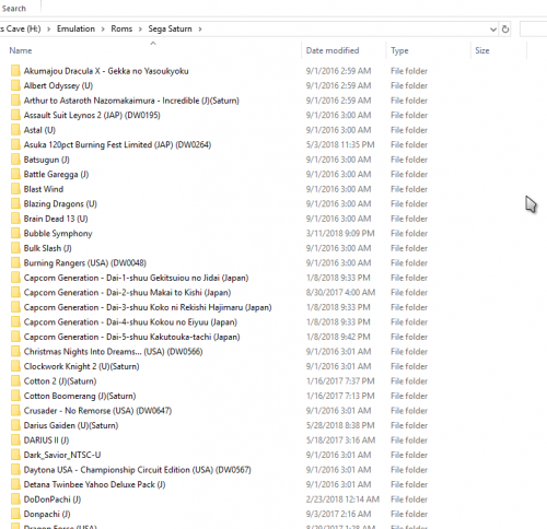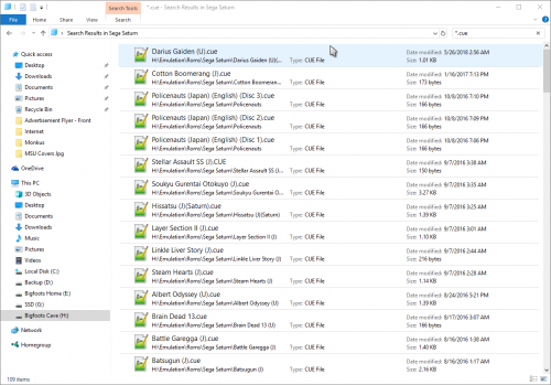 I'd start by removing all your Saturn games and then you can go to the folder where your Saturn games are in your file manager. In the search box type *.cue This will show all the cue files in that folder and any sub folders you may have like this. Then you can select all of them (Control + A) and just drag them into LB to start the import process.