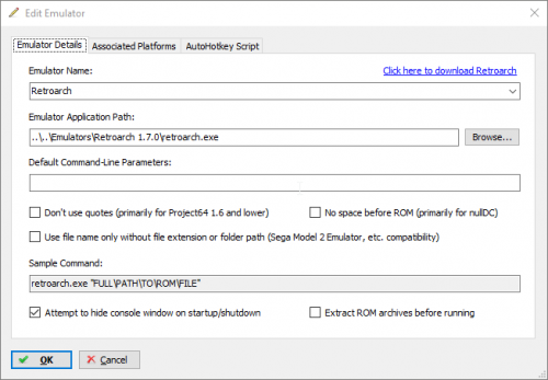 You can modify the command line to anything necessary, unfortunately I have not messed with the Sufami stuff nor do I use the stand alone version of Snes9x to know the exact command line parameters required. One example though to load Gameboy games using the Super Gameboy and BSnes core in Retroarch: -L "cores\bsnes_accuracy_libretro.dll" "H:\Emulation\Roms\Super Nintendo\Super Game Boy 2 (Japan).sfc" --subsystem sgb