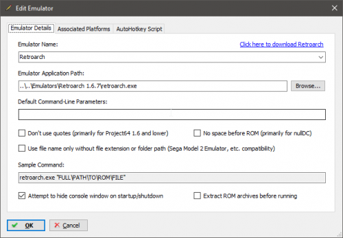 Can we see this window ? Your associated platforms look good as long as you didn't change your actual platform names because they have to match up with the platform names in the associated platforms. Does your Retroarch work outside of Launchbox.
