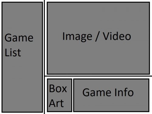 Yeah, i'd say a text or clear logo wheel with Box and maybe a screenshot / video if that can fit in without too much clutter but I doubt that would work. Maybe games list on either left or right taking up a quarter or 1/3 of the screen. Then whats left split that up in 2/3 : 1/3 split horizontally. In the 2/3 section at top put screenshot / video. And in the 1/3 section at the bottom a small boxart and some game info. That's what i'm seeing in my head at least, obviously would have to see if it actually worked in practice. I'm a terrible artist but i'm imagining something like this as a mockup.