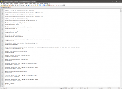 Run it once with the following command line parameters and it should automatically put them in the config file for you. Or you can just look in the config for each of the settings in the "ss" section of it. -ss.scanlines 40 -ss.special nn2x -ss.stretch aspect_int -video.driver opengl -video.glvsync 0 -video.blit_timesync 0 -ss.input.port1 3dpad -cd.image_memcache 1 -ss.cart auto