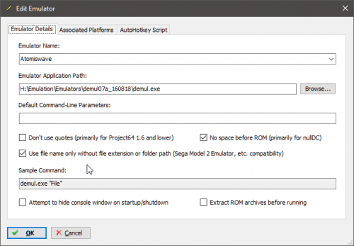 For the arcade stuff in Launchbox you will want to create a 2nd instance of your Demul emulator called something like Demul Arcade for example. You can still use the same Demul install and setup, just create a 2nd instance of it in LB. The reason is it requires a different setting to function. You want "Use file name only without file extension or folder path" turned on.