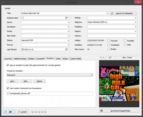 Here is an example of using a custom command parameter. I am using Retroarch and the BSNes core for my Snes MSU games but certain games need to use the Snes9x core because of no .bml file. Click the use custom command line parameter and then enter the parameter in the box below that.