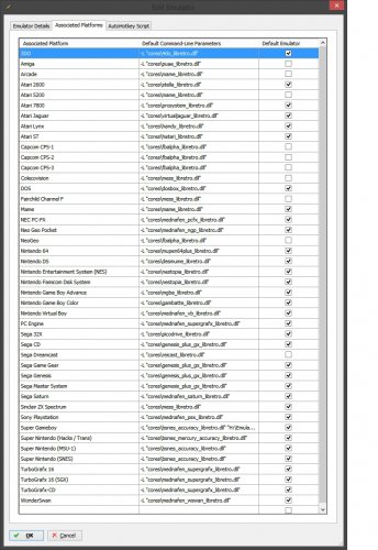 Here's a couple of screen shots, one is of my actual cores I have in my \Retroarch\cores folder and the other is of the command line parameters in the edit emulators window of Launchbox.